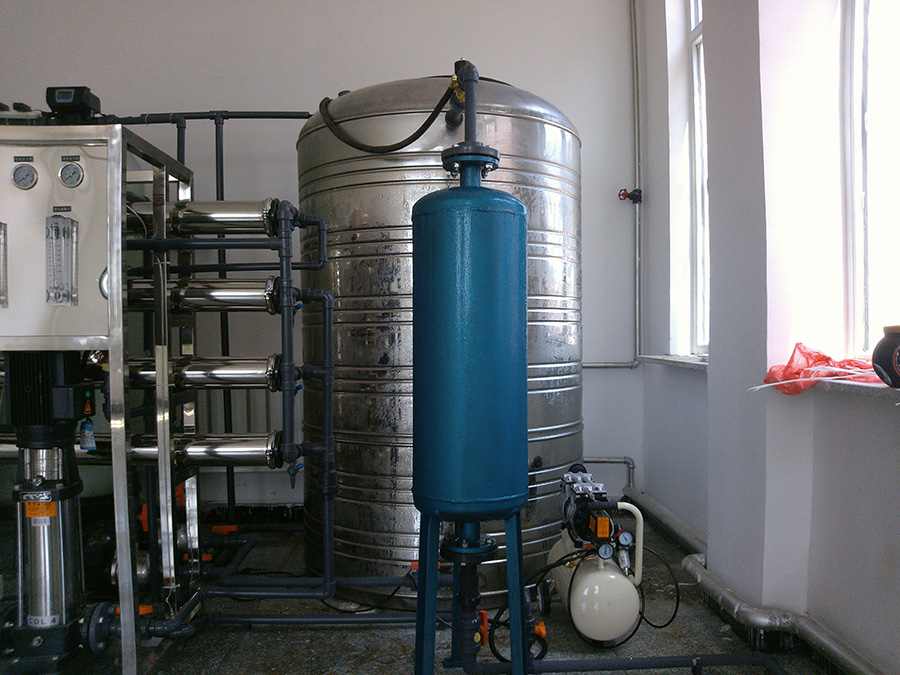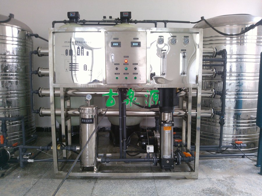 該項目現(xiàn)場位于遼寧省阜新市,原水為深井地下水,出水水質(zhì)要求達(dá)到飲用水標(biāo)準(zhǔn),用來給學(xué)生們食堂做飯及飲用。我們給設(shè)計研制了一套產(chǎn)水量為2T/h的反滲透設(shè)備,采用了4組8040的白鋼膜殼配上8支陶氏4040的反滲透膜,產(chǎn)水量達(dá)到2T/h。在出水端,配備了2-40的南方臥式泵兩臺(一備一用),采用變頻恒壓供水系統(tǒng)進(jìn)行控制,以保證用水端的水壓恒定水量充足。